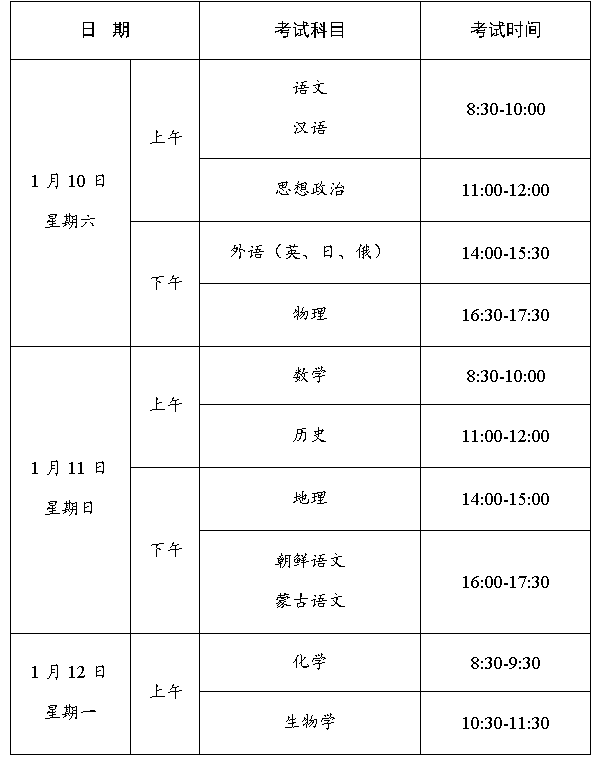 本次学业水平考试科目包括:语文(含民族语文、汉语)、数学、外语(含英、日、俄)、思想政治、历史、地理、物理、化学、生物学共9科;普通高中二年级在籍学生新开考语文、数学、外语(含英、日、俄)、思想政治和物理5个考试科目。